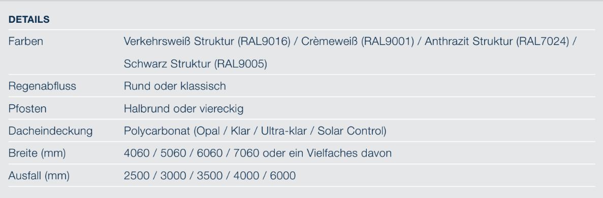 Diese Terrassenüberdachung ist perfekt verarbeitet und bietet eine breite Auswahl hinsichtlich der Verarbeitung, zum Beispiel einen runden oder klassischen Regenwasserabfluss und halbrunde oder viereckige Pfosten. Dadurch können Sie dieses Modell komplett entsprechend Ihrem Stil, Geschmack und Wünschen anpassen und dafür sorgen, dass es perfekt zu Ihrem Haus und Garten passt.